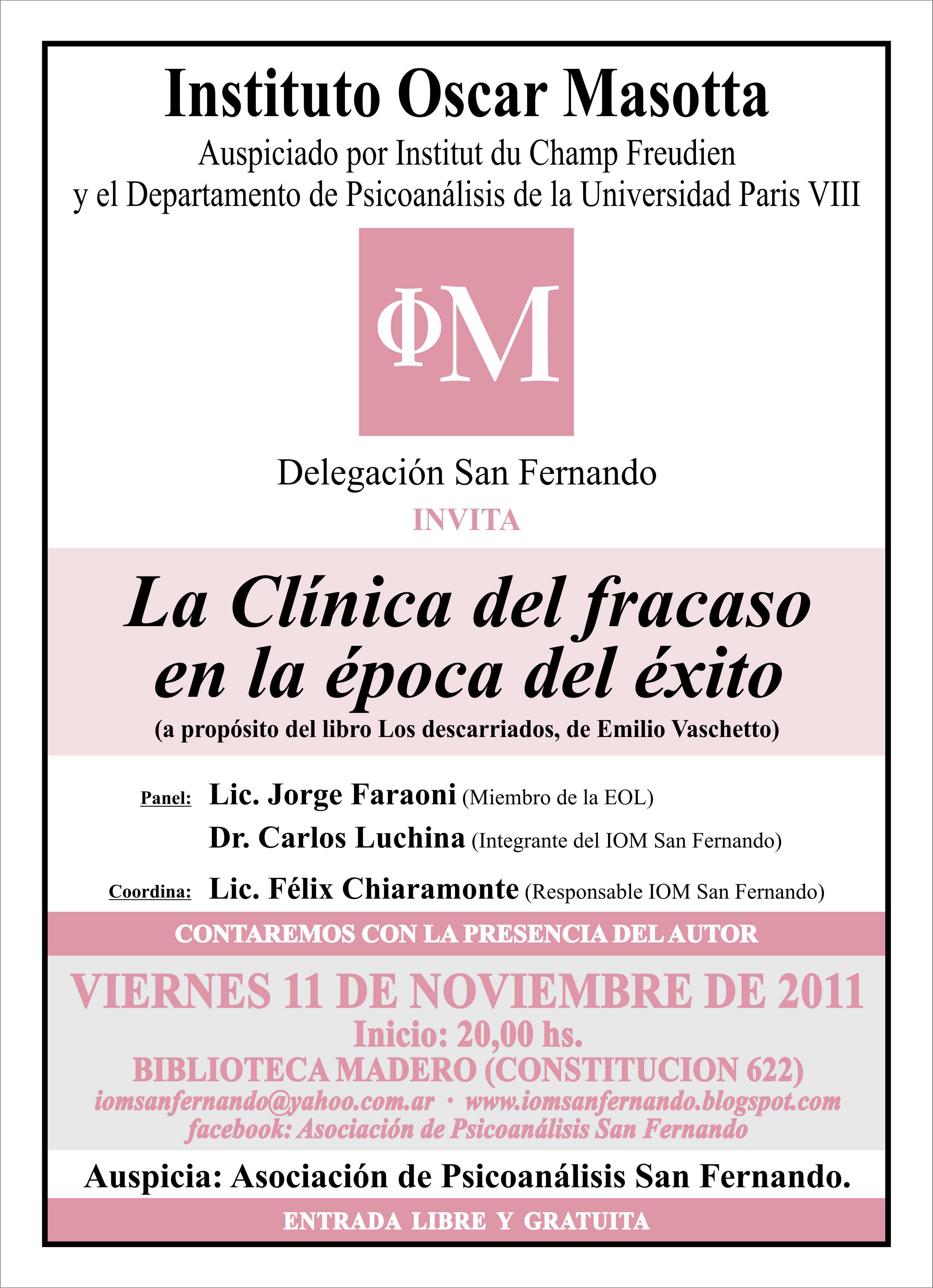 Ocorrerá na próxima sexta-feira, dia 11 de novembro, as 20hs o evento: La clínica del fracasso en la época del éxito. O evento é realizado pelo Instituto Oscar Masotta, sede San Fernando (Argentina).