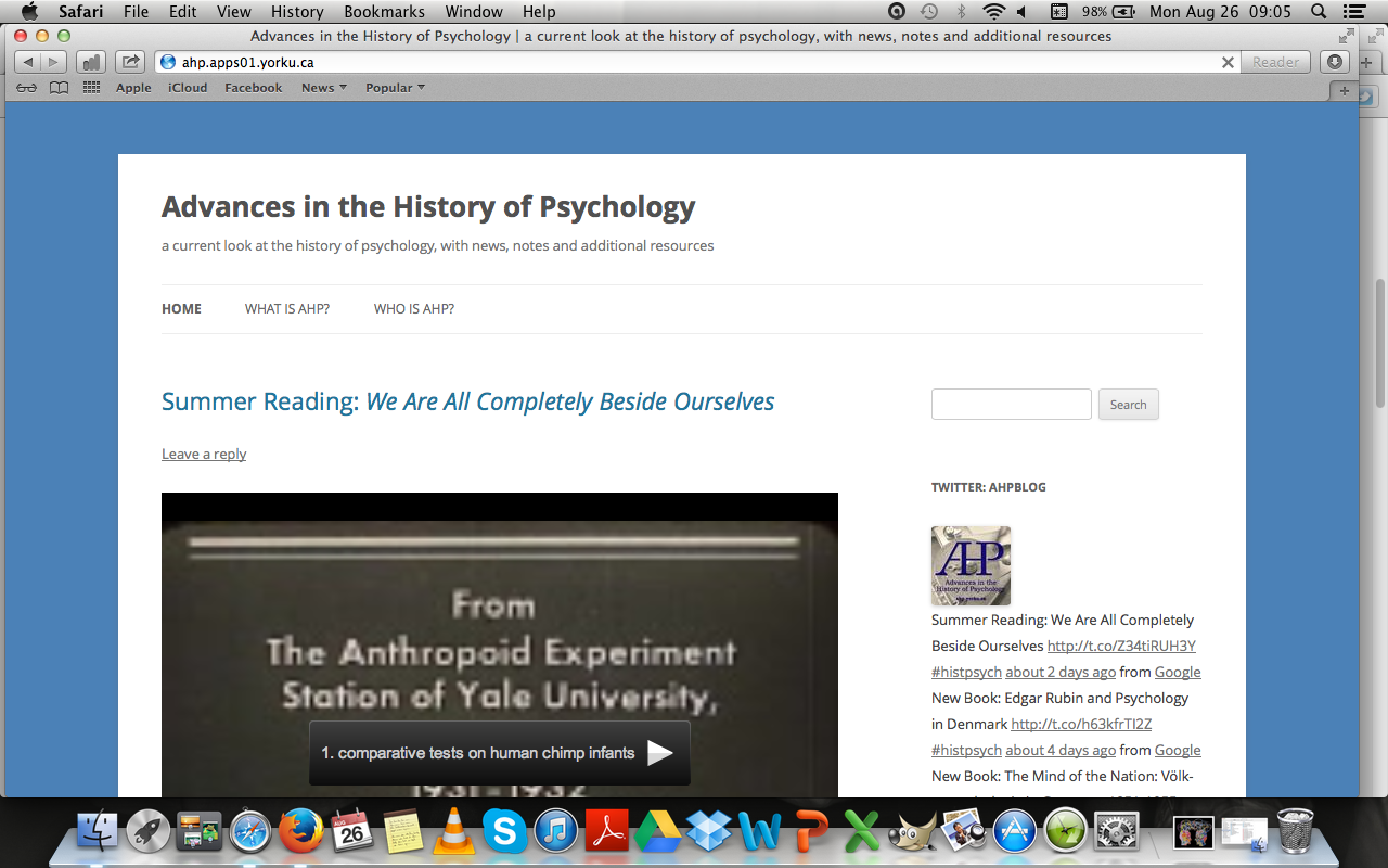 In the History of Psychology (HoP) we can observe this same kind of effort at online science communication. For instance, the blog Advances in the History of Psychology (AHP) has been running since 2007. AHP began as an experiment in communicating news, notes, and resources relevant to the history of psychology to as broad an audience as possible. In recent years this mandate has seen AHP expand onto Facebook and Twitter.