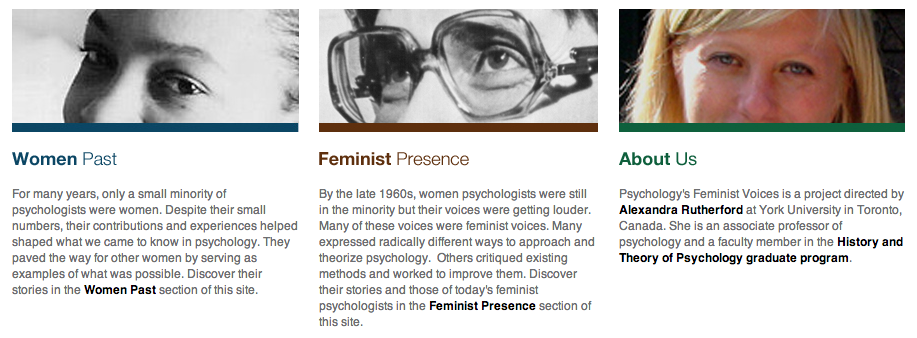 Más allá de estos referentes espaciales, el blog Psychology’s Feminist Voices hace un recorrido por las trayectorias des-localizadas que, en gran medida, contribuyen a situar temporalmente la labor y el reconocimiento de “grandes mujeres” en la historia de la psicología. Des-localizadas, en tanto se considera que existen vínculos que trascienden las condicionantes geográficas que refieren al status en el cual ha sido situada la mujer, y entrelaza -entreteje- el aporte que diversas profesionales e investigadoras -también profesionales- han realizado a la disciplina. Mujeres que han visto afectadas sus carreras frente a los mecanismos de exclusión y formas de discriminación en la sociedad en general y, en particular, en este espacio profesional.