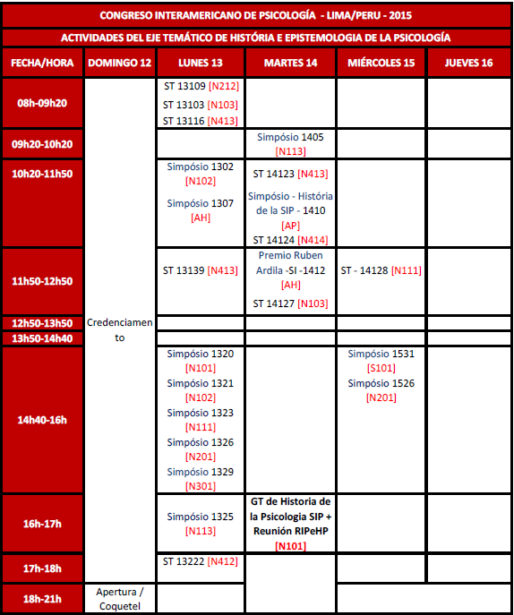 Além do encontro do Grupo de Trabalho de História da Psicologia da SIP e da reunião de nossa Rede, haverá também a participação de pesquisadores da área de história da psicologia, apresentando e discutindo suas mais recentes investigações no campo. Todas essas atividades, que constituem o eixo temático “História e Epistemologia da Psicologia”, estão organizadas nesta tabela, de acordo com os seus respectivos dias e horários. Importante lembrar que eventuais mudanças nos horários das atividades podem ocorrer e que tais alterações devem ser acompanhadas diretamente na página do evento ou com a equipe organizadora.
