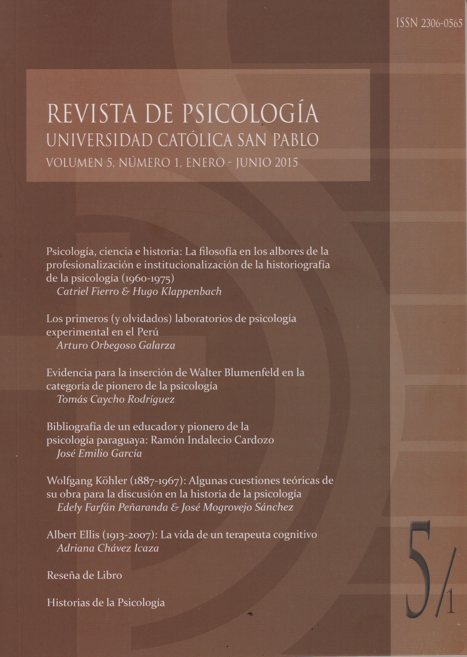 Otro trabajo corresponde a Arturo Orbegoso, quien desde hace más de diez años se dedica a la investigación historiográfica de la psicología en el norte del país. En este número, se tiene un artículo de su autoría, sobre los primeros laboratorios de psicología experimental en las primeras décadas del siglo XX (el de la escuela Normal y el del Hospital Víctor Larco Herrera), que antecedieron a los laboratorios fundados en las universidades, iniciando con el de la Universidad Nacional Mayor de San Marcos en 1935, de la mano de Walter Blumenfeld, precursor de la psicología científica en el Perú. Precisamente, un siguiente trabajo, nos ofrece un análisis de por qué Blumenfeld debe ser considerado como un pionero de la psicología peruana. Este trabajo de Tomás Caycho revisa ocho criterios que fundamentan tal argumento, en base a la producción académica y la labor institucionalizadora del psicólogo alemán.
