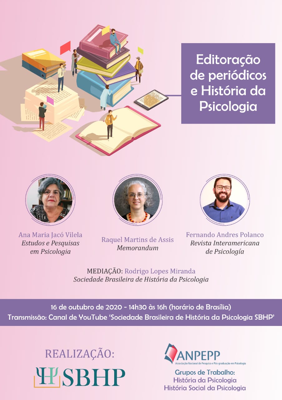 El próximo viernes 16 de octubre de 2:30 pm a 4:00 pm (hora de Brasilia, UTC-3) se realizará un webinar en el que nuestras colegas de la Red Ana Jacó (UERJ), Raquel Assis (UFMG) y Fernando Polanco (UNSL), discutirán sobre la publicación de revistas y la historia de la psicología. El evento es organizado por la Sociedade Brasileira de História da Psicologia y los grupos de trabajo Historia da Psicologia e História Social da Psicologia de ANPEPP. Se puede acceder al webinar, haciendo clic aquí, o verlo directamente en el enlace a YouTube incrustado al final de esta nota.
