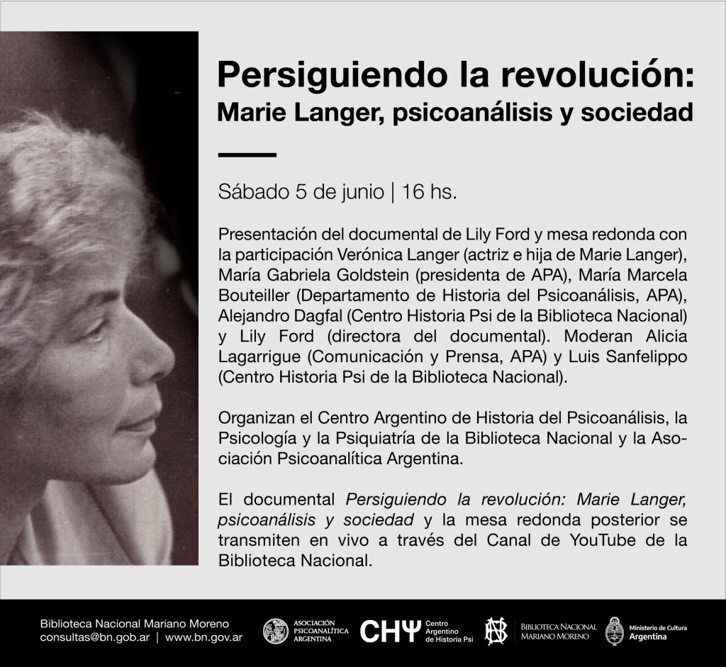 El Centro Argentino de Historia “Psi” de la Biblioteca Nacional Mariano Moreno y la Asociación Psicoanalítica Argentina (APA) presentarán públicamente el documental “Persiguiendo la revolución: Marie Langer, psicoanálisis y sociedad” dedicado a una de las más destacadas psicoanalistas de nuestro país. El próximo sábado 5 de junio a las 16 hs, el documental se transmitirá en vivo por el canal de Youtube de la Biblioteca, seguido por una mesa redonda en la que participarán Verónica Langer (actriz e hija de Marie Langer), María Gabriela Goldstein (presidenta de APA), María Marcela Bouteiller (Departamento de Historia del Psicoanálisis, APA), Alejandro Dagfal (Centro de Historia “PSI” BNMM) y Lily Ford (directora del documental). Moderan Alicia Lagarrigue (Comunicación y Prensa, APA) y Luis Sanfelippo (Centro de Historia “PSI” BNMM).