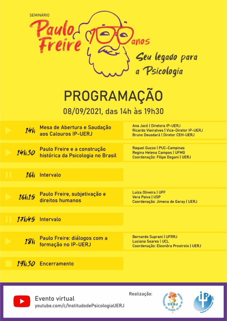 Na próxima quarta-feira, dia 8 de Setembro, o Instituto de Psicologia da Universidade do Estado do Rio de Janeiro realizará um evento em comemoração aos 100 anos de nascimento do educador e filósofo brasileiro Paulo Freire. Com o título “Seu legado para a Psicologia”, o seminário conta com palestras que articulam o pensamento do autor às seguintes temáticas: Construção histórica da Psicologia no Brasil; Subjetivação e direitos humanos e Diálogos com a formação no IP-UERJ. O evento será virtual e transmitido pelo canal do Instituto de Psicologia da UERJ.