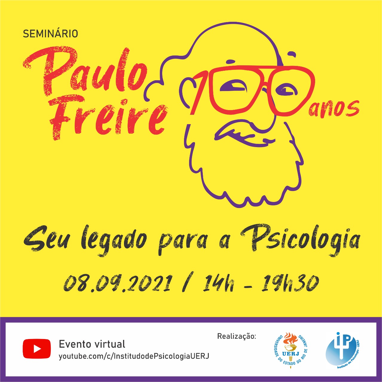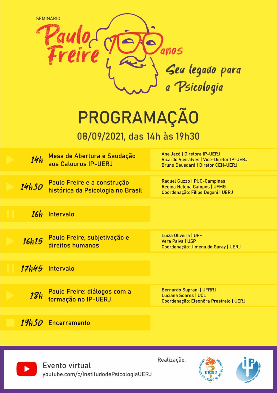 Na próxima quarta-feira, dia 8 de Setembro, o Instituto de Psicologia da Universidade do Estado do Rio de Janeiro realizará um evento em comemoração aos 100 anos de nascimento do educador e filósofo brasileiro Paulo Freire. Com o título “Seu legado para a Psicologia”, o seminário conta com palestras que articulam o pensamento do autor às seguintes temáticas: Construção histórica da Psicologia no Brasil; Subjetivação e direitos humanos e Diálogos com a formação no IP-UERJ. O evento será virtual e transmitido pelo canal do Instituto de Psicologia da UERJ.
