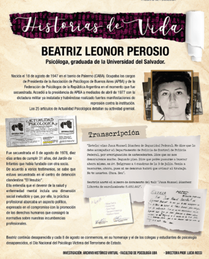 Dentro del grupo fundador de estas agremiaciones se encuentra Beatriz Leonor Perosio, quien ocupaba la presidencia de la Asociación de Psicólogos de Buenos Aires (APBA) y de la Federación de Psicólogos, cuando el fatídico 8 de agosto de 1978 fue secuestrada y desaparecida por la dictadura militar. Hoy, Perosio continúa desaparecida y todos los 8 de agosto se conmemora en su homenaje y en el de todos los colegas y estudiantes de psicología desaparecidos, el Día Nacional del Psicólogo Víctima de Terrorismo de Estado.