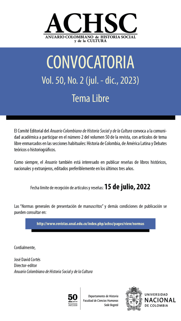 Esta revista, una de las más relevantes del campo histórico en Colombia, invita a presentar trabajos para su próximo número, en cualquier temática dentro de las áreas de referencia del Anuario. Para mayor información, ver la imagen adjunta o consultar en la página de la revista, haciendo click aquí.