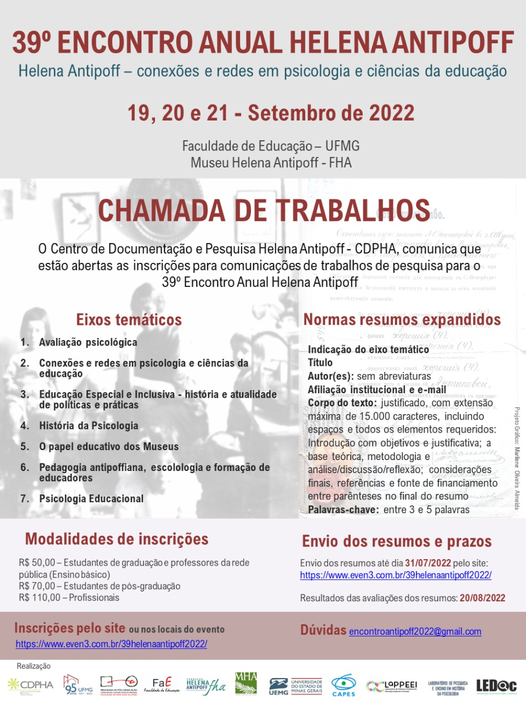 O Encontro Anual Helena Antipoff deste ano será de 19 a 21 de setembro, na Universidade do Estado de Minas Gerais, Unidade Ibirité (Ibirité, Minas Gerais, Brasil) e, recentemente, teve prorrogado o prazo para submissão de trabalhos, que ficou para até o dia 10 de agosto.