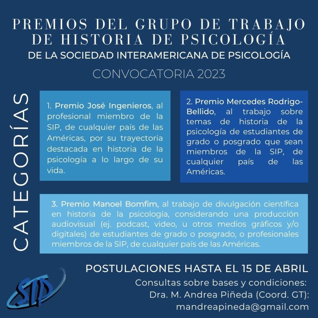 Con la pretensión de promover y reconocer el trabajo de excelencia en investigación, difusión y formación en historia de la psicología y también de celebrar el legado de figuras históricas de la psicología en las Américas, el grupo de trabajo en Historia de la Psicología de la Sociedad Interamericana de Psicología empezará a entregar en el próximo congreso de la Sociedad una serie de premios que han recibido los nombres de José Ingenieros, Mercedes Rodrigo y Manoel Bomfim y cuyos criterios pueden revisarse en la siguiente imagen: