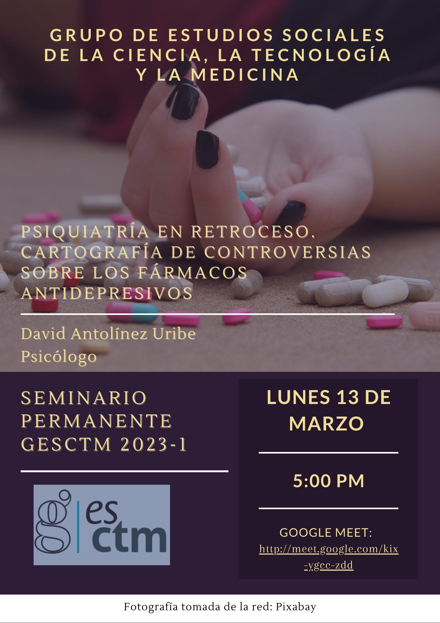 Para esta primera sesión el invitado es el psicólogo David Antolínez Uribe, quien presentará su trabajo Psiquiatría en retroceso. Cartografía de controversias sobre los fármacos antidepresivos. La sesión se realizará en modalidad virtual y el acceso es libre, a través de este enlace.