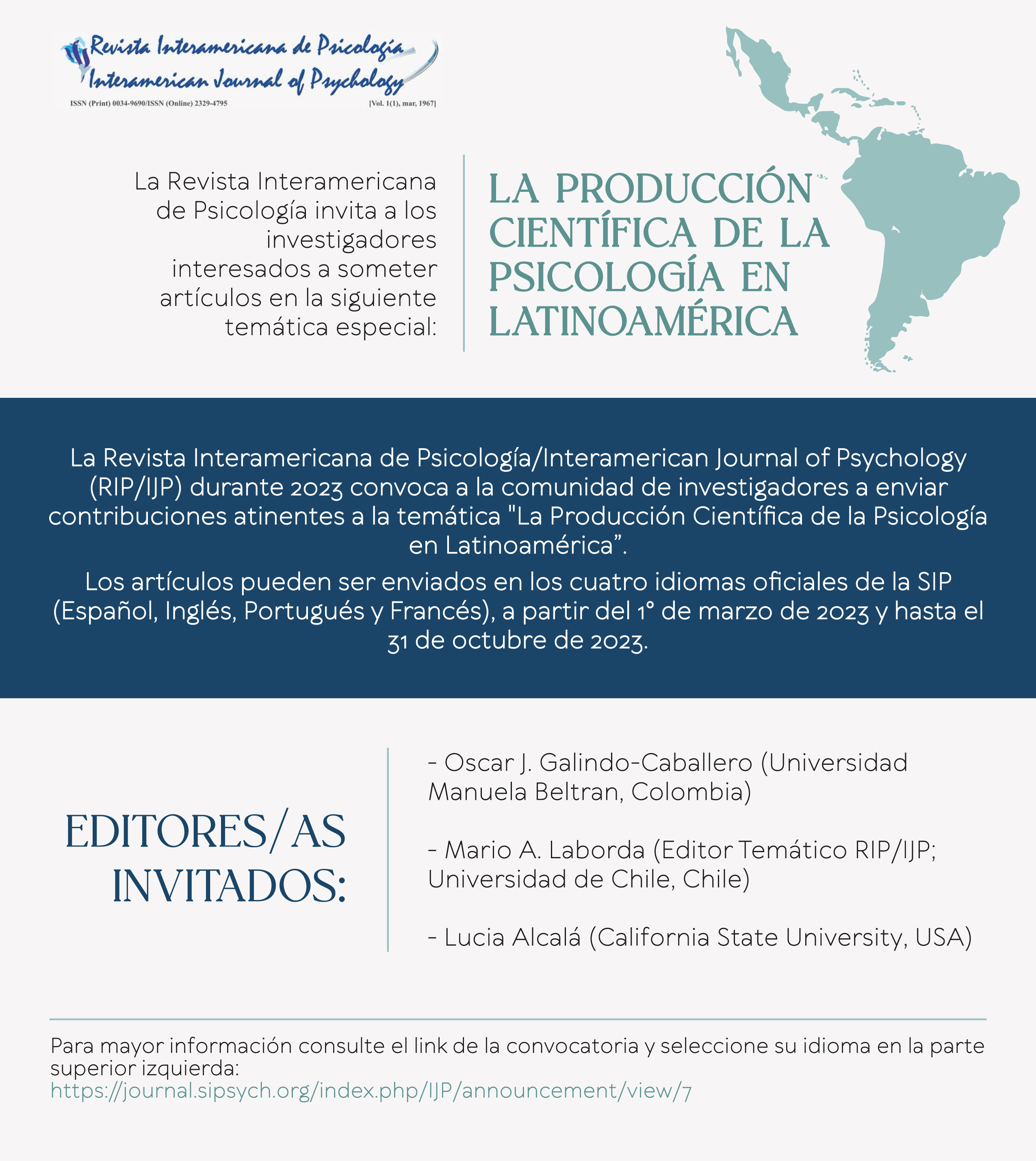La Revista Interamericana de Psicología/Interamerican Journal of Psychology (RIP/IJP) durante 2023 convoca a la comunidad de investigadores a enviar contribuciones atinentes a la temática “La Producción Científica de la Psicología en Latinoamérica”. Los artículos pueden ser enviados en los cuatro idiomas oficiales de la SIP (Español, Inglés, Portugués y Francés), a partir del 1° de marzo de 2023 y hasta el 31 de octubre de 2023.