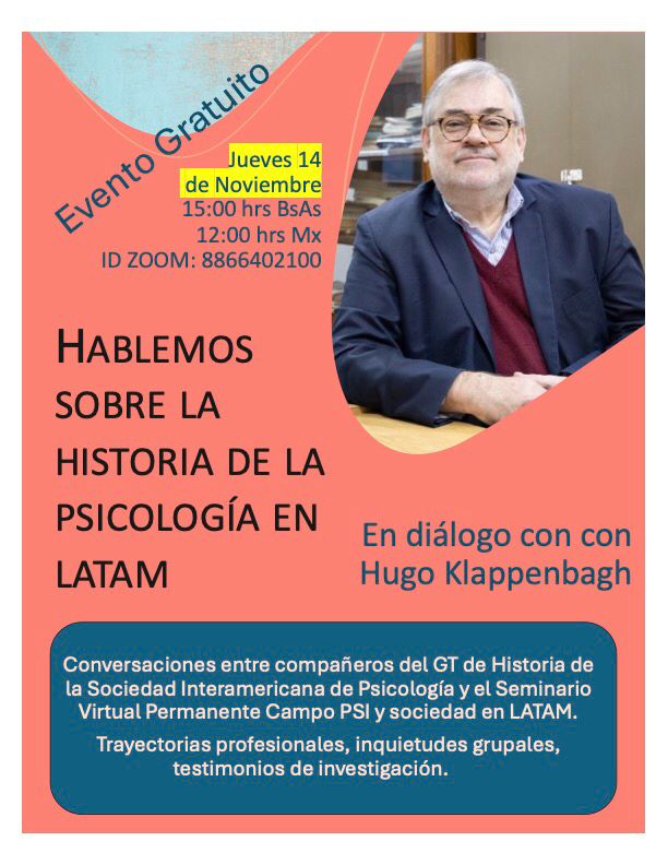 Nesta quinta-feira, 14 de novembro, às 15:00 (horário de Buenos Aires e Brasília), será realizado o evento “Hablemos sobre la Historia de la Psicología en LATAM”, com a participação de Hugo Klappenbach.